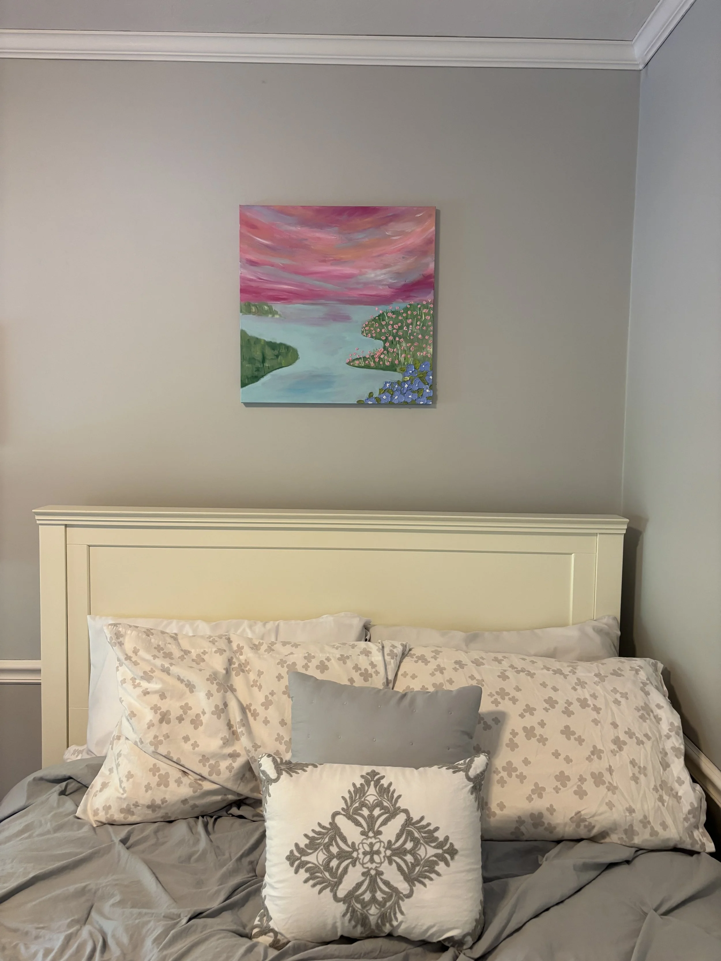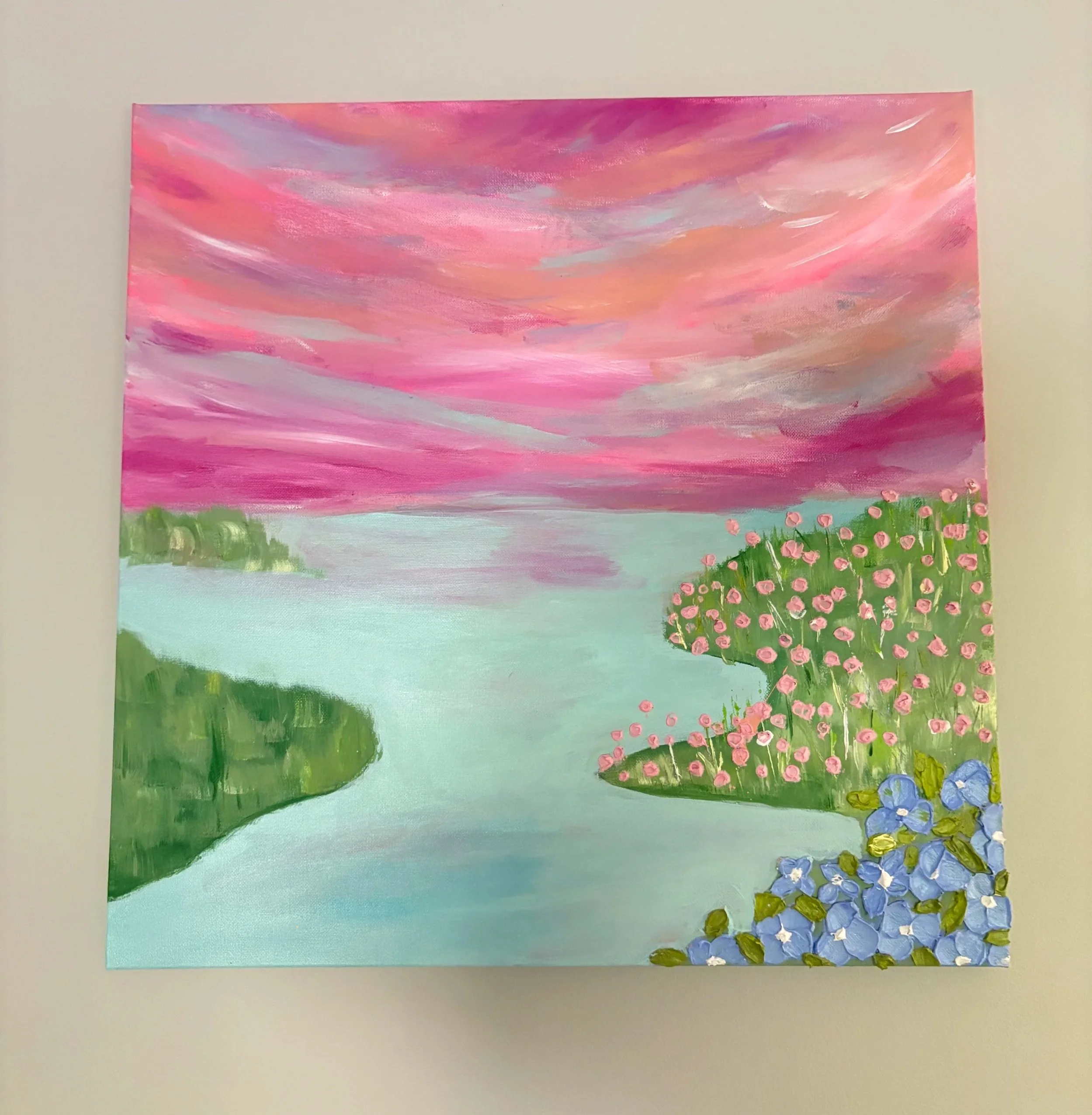 This 24×24 Canvas makes you feel like you put your face in the water and opened your eyes to see the ocean world below. I used palette knives to create each sea creature, giving them a lively texture.